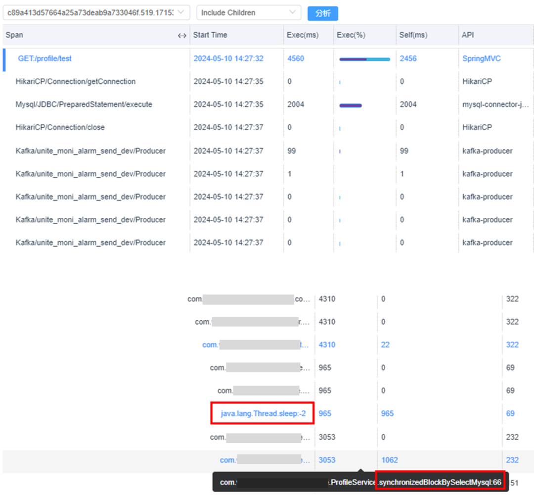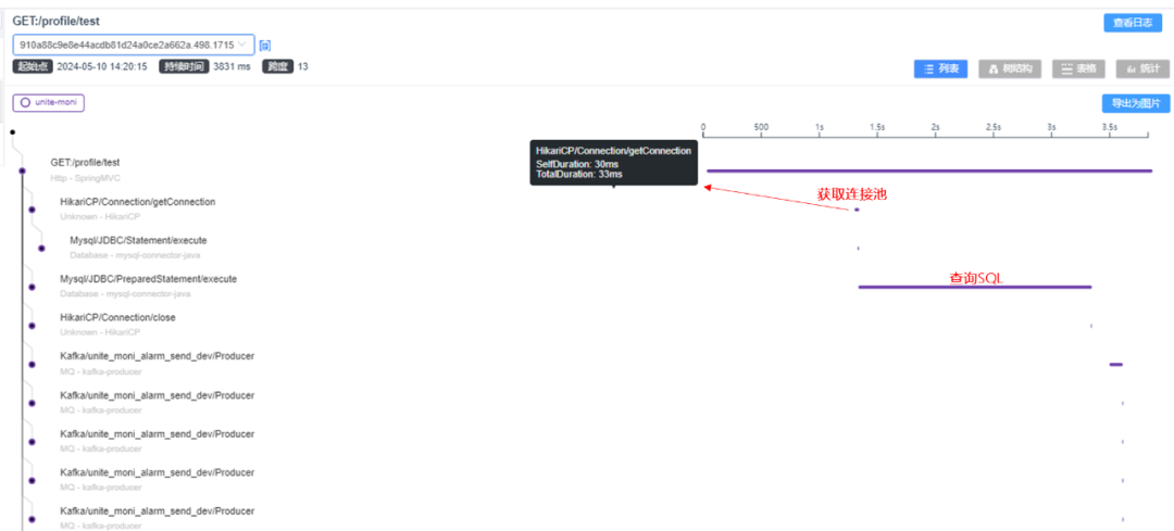 上图为/profile/test接口在SkyWalking的trace信息,显然可以看出请求中访问MySQL与Kafka,其中SQL的执行时间大约为2秒(图3中的MySQL/JDBC/PrepardStatement/execute为实际执行SQL的Span)。同时使用Hikari链接池工具获取数据库链接的信息也记录了,这个记录很有用,如果数据库链接池满了,一些线程可能一直在等待数据库链接池释放,在某些情况下很可能是用户数据库链接池配置少了。
