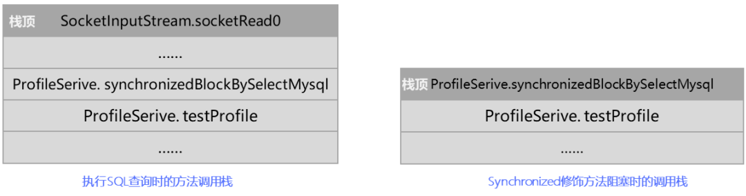 关于synchronizedBlockBySelectMysql方法的,如果是执行sql耗时,采集到的应该如图6左侧那样看到的是正在执行SQL的socketRead0方法,而这里显示的是synchronizedBlockBySelectMysql这个代码块,即性能剖析时SkyWalking采集到的数据方法栈的栈项为
