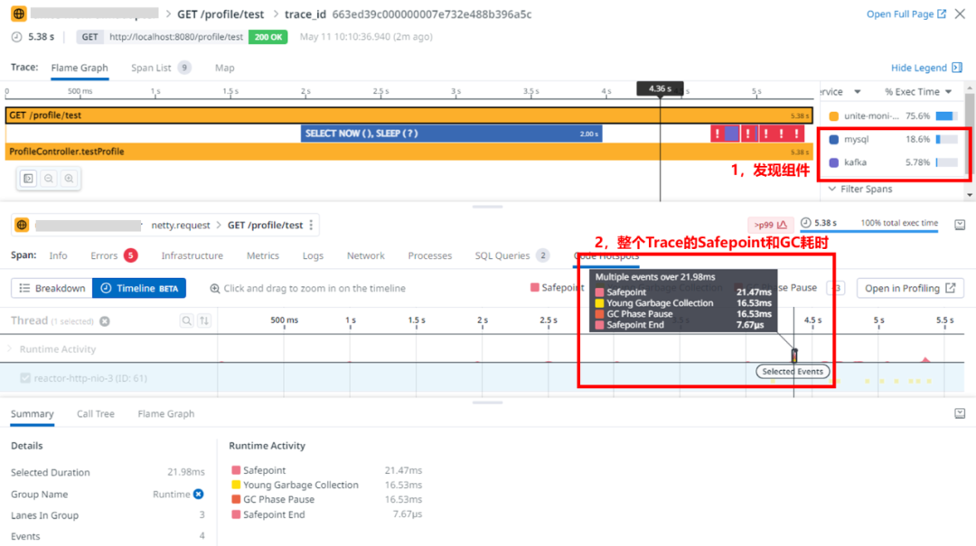 不过感觉到意外的是可以在DataDog中看到这次trace的Safepoint和GC占用时间,这样用户可以分析出该Trace是否受到Safepoint和GC影响。