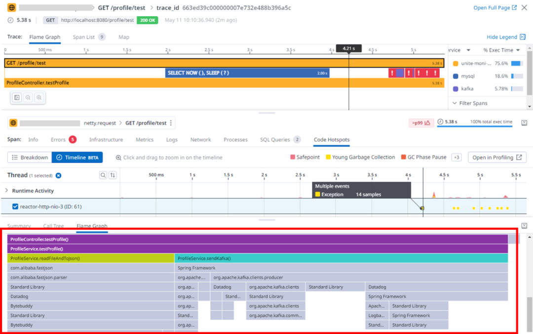 从DataDog的Trace信息中我们可以看出DataDog也能直接发现MySQL与kafka组件,同时提供这次trace的火焰图,从火焰图中能够看出readFileAndTojson方法执行。但doSleep方法与synchronizedBlockBySelectMysql方法关键字synchronized同步等待的时间没被观测到。