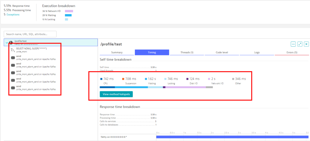 图9为/profile/test接口在Dyantrace中的一个Trace信息,图中左侧红框可以直接看到MySQL和Kafka组件,中间红框是这次trace的线程整体时间分布情况,包括CPU时间,Suspension挂起时间,还有Waiting、Locking、Disk I/O和网络I/O ,为了方便大家理解深层的性能特征他们用不同的颜色区分,具体说明如下: