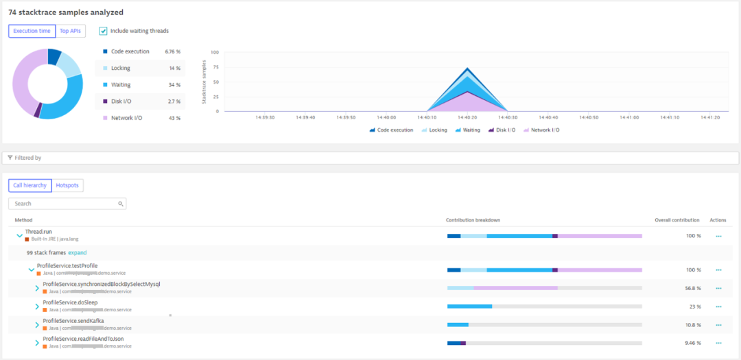 CPU Profiling:深入了解进程的方法热点,按代码执行、网络 I/O、磁盘 I/O、锁定时间和等待时间分解和过滤数据,常见的火焰图正是CPU Profiling的产品体现。