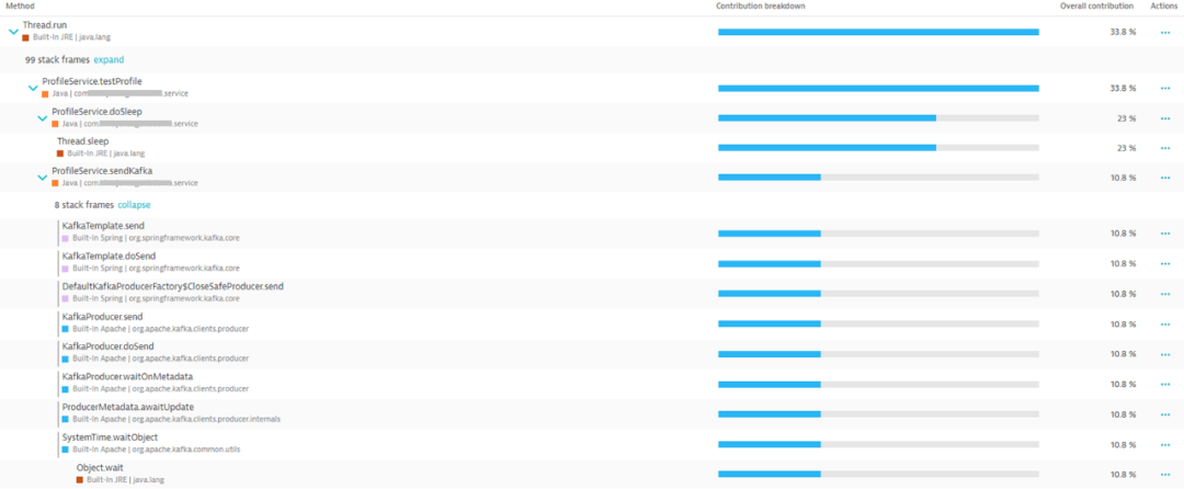 图11是展开doSleep与sendKafka两个Waiting方法分析,可以明显看出doSleep方法实际上底层耗费在Thread.sleep,而sendKafka方法的Waiting是Kafka底层工具类SystimeTime.waitObject中执行更底层的Object.wait。