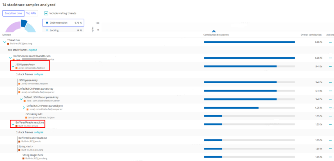 图12为选定”Code execution“后再展开readFileAndToJson方法,这里两处主要耗费CPU的操作,一个是JSON.parseArray,一个是BufferedReader.readLine。