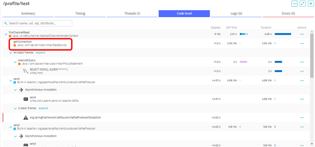除了方法热点分析,Dynatrace还提供了”Code level“的分析,从图13中可看到Hikari链接池的获取情况。