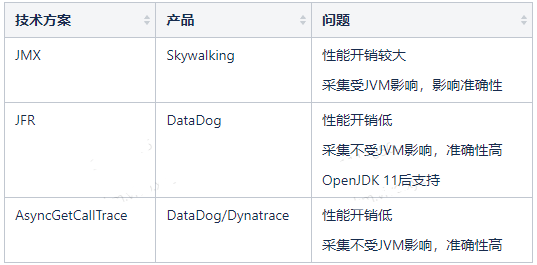 上述三种方案便是实现CPU Profiling的主流方案,这三个方案在我们之前分析的三个产品中使用情况如下:
