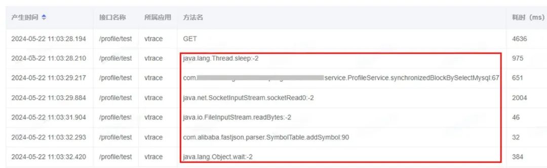 配置好性能剖析规则后,再次发出/profile/test请求。等待了一段时间,从图5中可以看到doSleep和synchronizedBlockBySelectMysql方法的执行情况。