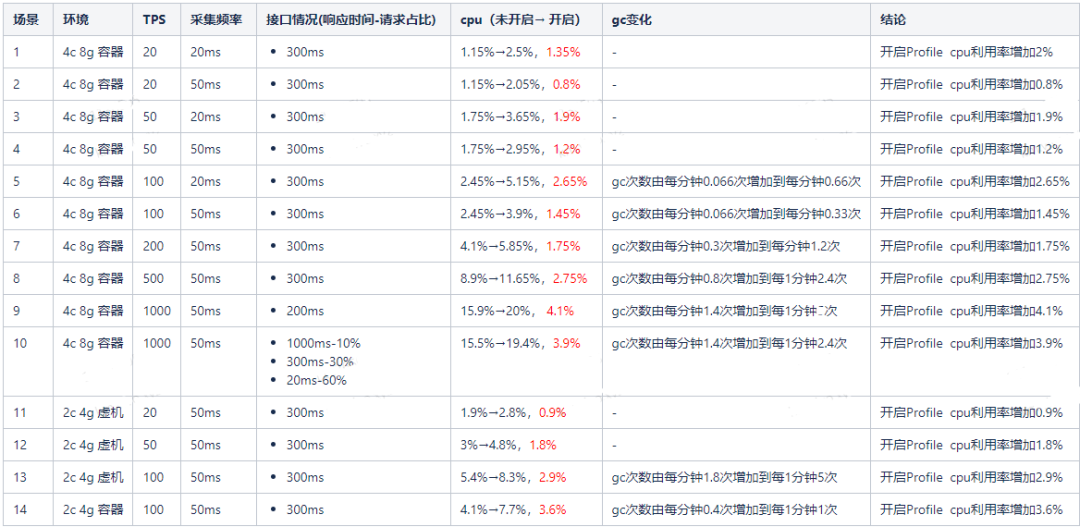 场景1与场景2、场景3与场景4、场景5与场景6三组采集频率不同的对比测试,可以看出Profile采集频率直接影响服务的资源消耗。