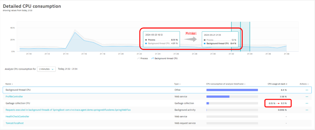 虽然这个场景可以直接使用Dynatrace的方法热点分析,但从进程到线程对比开启Profile采集前后指标,整个流程会更加顺畅,同时这样的排查思路与产品呈现会带来一些设计上的启发。