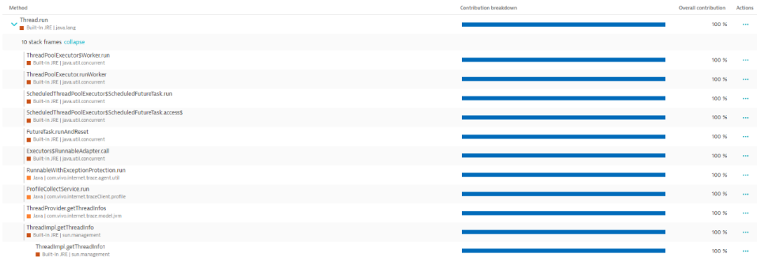 上述结论我们知道开启采集后导致进程CPU使用率增加的主要有后台线程和GC线程,GC线程略有增加主要还是采集时额外使用的内存增加导致,所以下面我们重点对后台线程分析,这里用到的便是Continuous thread analysis功能。
