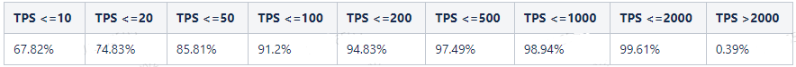 目前接入Vtrace的2500+个服务中有200多个服务他们实例的平均TPS大于100 ,而单实例平均TPS小于100的服务占91.2%。下面表格中的数据是基于工作日某一分钟统计得出的当前Vtrace所有服务实例平均TPS值的分布情况: