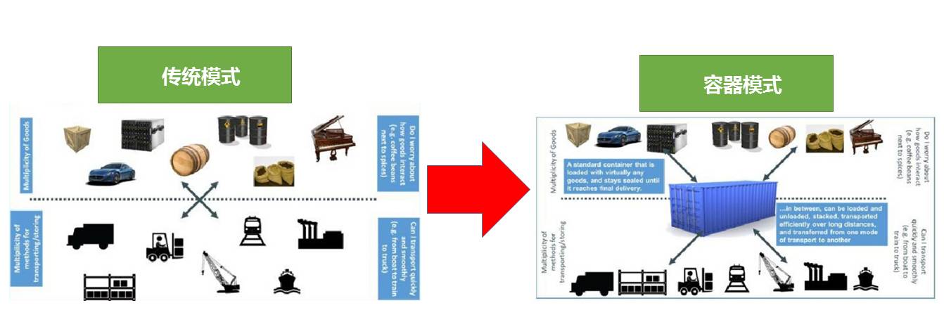 我们看到传统模式它没有集装箱来装这些货物,而货物是散乱的,只能一件一件来运输,来回运输效率非常低下。而容器模式就好比集装箱,将所有的货物集中放在箱子里面一次性能进行运输,省去了来回重复的工作,提高了货物运输的效率。而docker容器的再现,是改变传统软件生产和软件交付的方式,必将对IT产业的变革产生深远的影响。