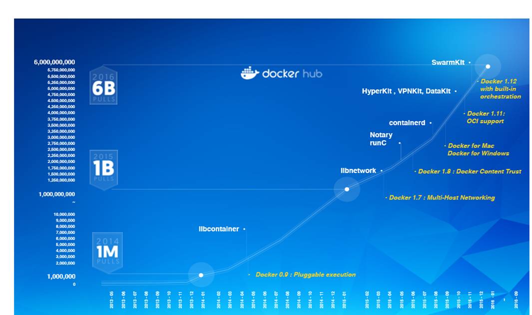 从这张图我们可以观察到docker发展飞快,不仅是他的市值增长很快,版本迭代更新得也很快。