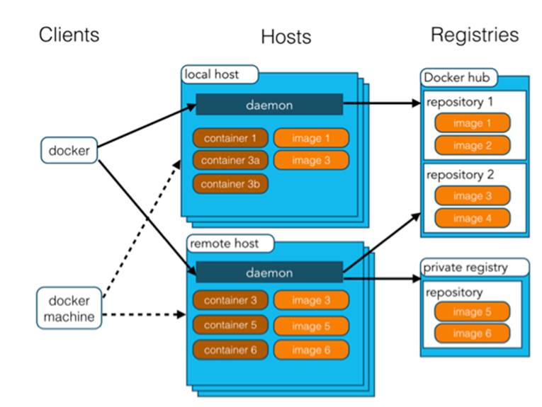 Docker客户端: Docker 客户端通过命令行或者其他工具使用 Docker API 与 Docker 的守护进程通信。