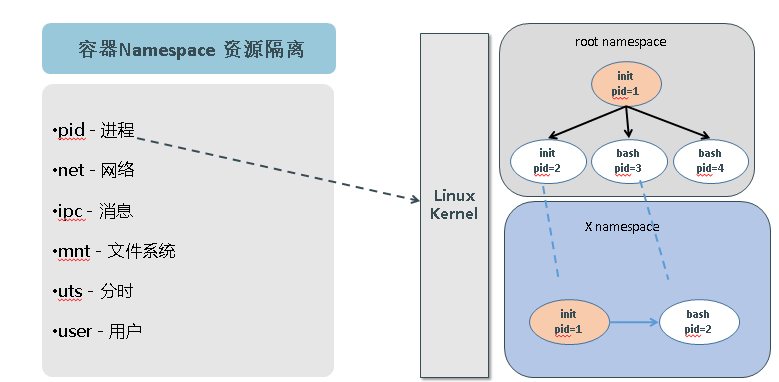Namespaces:LXC所实现隔离性,主要来自kernel的namespace,其中pid,net,ipc,mnt,uts等Namespace将容器的进程,网络,消息,文件系统和hostname隔离开