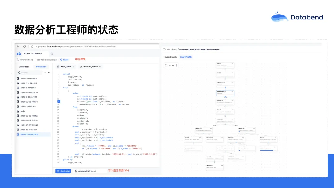2023年,在短视频行业中服务的一家客户就采用了这种模式。当时客户在内部私有化部署了一套 Databend,用于广告投放和数据分析。他们的老板每天盯着这些广告数据情况,一旦有问题可能会立刻打电话过来。同时,他们把核心数据注册到了 Databend Cloud 上,内部的数据分析团队和数据科学家们可以通过 Databend Cloud 自由进行更复杂的数据分析和探索,而不需要影响公司的核心业务系统。这样一来,客户只需要负责核心业务的数据安全和性能保障,数据分析和挖掘等工作可以通过 Databend Cloud 以极低的成本完成。