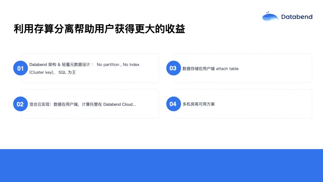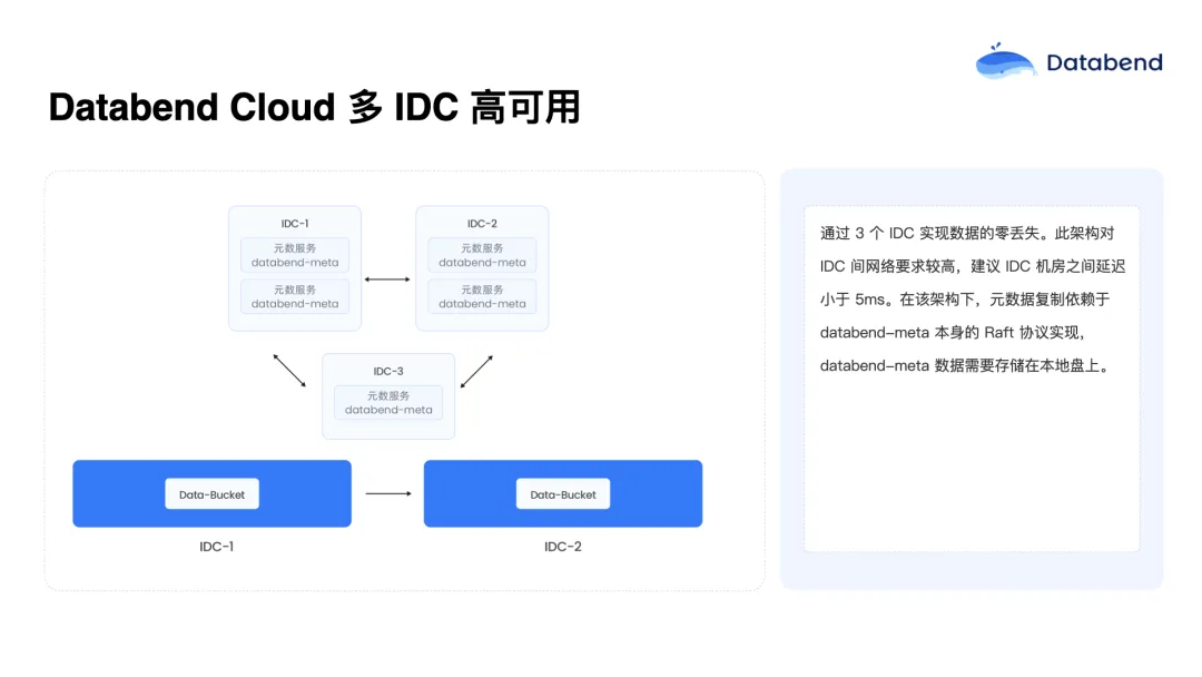目前 Databend 正在进一步探索,即把元数据直接存放在对象存储中。这样的话,元数据在两个对象存储之间也可以直接实现数据复制。如此一来,计算节点和元数据节点几乎都不需要额外部署,用户可以更加方便地实现多个 IDC 之间的快速部署和数据复制。例如,在其中一个地方的数据中心挂载一个计算集群之后,甚至以只读方式快速拉起,直接对外提供服务是完全可行的。只要不在两个 IDC 同时往数据里写入即可,除非两个对象存储之间也能实现双向复制,那么就可以实现真正的双 IDC 数据写入高可用。