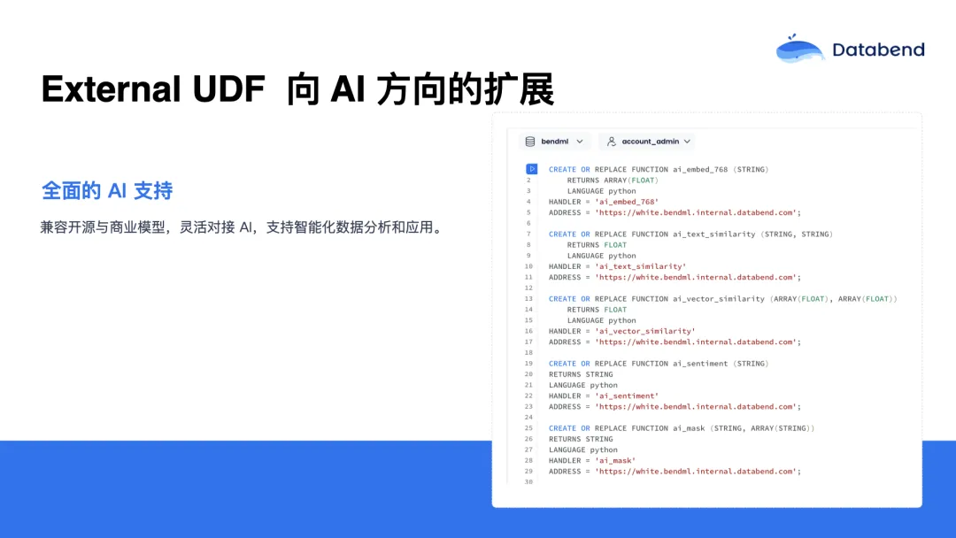 在以上基础上,Databend 进行了更深入的功能扩展,把 AI 的一些功能融合进来。比如,你可以把 AI 的一些功能封装成函数,然后注册到 Databend 内部,这样就能直接实现近似度检索(Similarity Search)、Embedding 向量计算,甚至 Text-to-SQL(自然语言转 SQL)等功能。