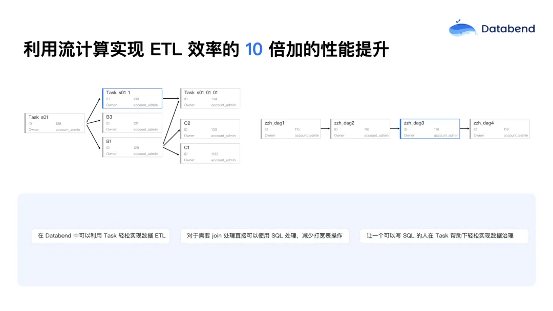 上图展示的是在 ETL 场景下,Databend 如何把数据从 ODS 层迁移到 DWD 层的具体流程: