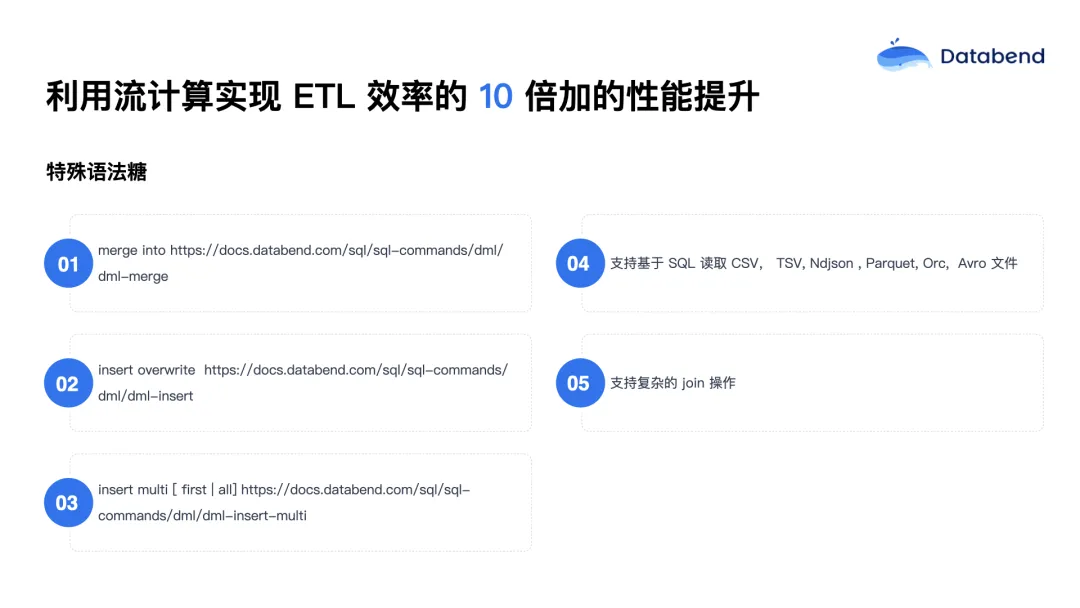 在实际使用中,也有一些客户依然会保留 Flink 和 Kafka 这样的组件。 在与一些车企或者物联网行业合作时发现,这些行业的数据很多都是二进制的格式。由于 Databend 目前无法直接处理二进制数据,因此需要使用 Flink 先将这些二进制数据转化为 JSON 或其他结构化格式,再由 Databend 来处理。目前 Databend 能够直接处理的格式包括 CSV、TSV、NDJSON、JSON、Parquet、ORC、Arrow 等常见格式,以及对应的压缩格式。基本上,Databend 能够替代 Spark 的绝大部分数据处理工作。