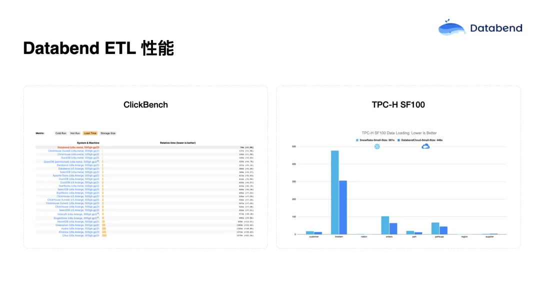 后来在 Databend 0.9 版本时期,在 AWS 的 C6a 裸金属环境下进行了一次严肃的 Benchmark,并且成功提交到了 ClickHouse 社区的性能榜单。众所周知,ClickHouse 社区对 Benchmark 提交要求非常严格。Databend 的成绩在 0.9 版本前顺利提交成功,并且在数据加载性能环节拿到了第一名。