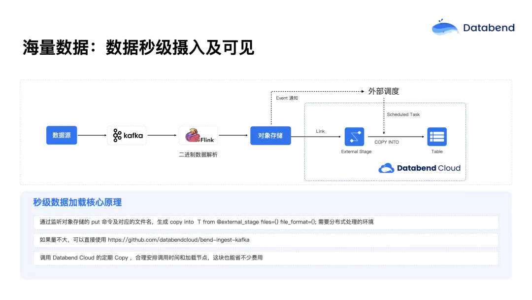 此外,Databend 也可以利用对象存储本身提供的事件(Event)通知机制。用户可以订阅对象存储的事件通知,当有 PUT 命令产生的文件时,通过 webhook 或任务调度系统(例如 Airflow),可以直接触发加载任务,将数据快速加载到 Databend 中。