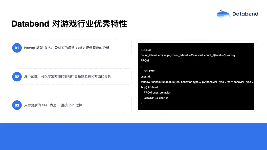 Databend 还在基础数据类型方面做了更多扩展,比如增加了 bitmap 和 Array map 等数据类型,尤其是在数组(Array)类型的处理方面,以前没有专门强调过数组类型,但实际上在大数据领域中数组类型用得非常广泛。比如广告领域经常使用的漏斗函数,用来进行留存分析,通过这种方法可以非常简单地计算出用户的行为路径,比如用户浏览主页后是否添加了商品,是否浏览了某个商品,这些行为是否符合推广预期,这种分析都可以通过数组类型及相应函数轻松实现。