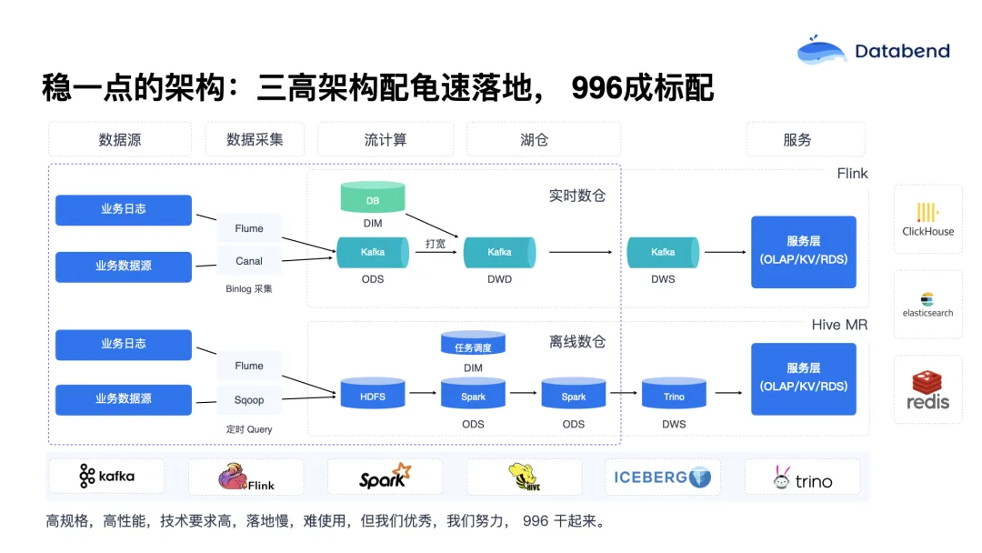 此外,平台稳定性也是很大的挑战。数据搬运工作往往占据了 80% 的工作量。数据工程师常常自嘲是“数据搬运工”,每天最擅长的事情就是把数据从 A 搬到 B,从 B 搬到 C,进行聚合计算和数据钻取分析。平台的计算资源瓶颈明显, 平台的任务队列化非常严重。MySQL 数据库讲究的是高并发,强调一次可以处理几万个并发请求,而传统大数据团队却常常忍受任务一个个慢慢跑,实际处理起来非常麻烦。