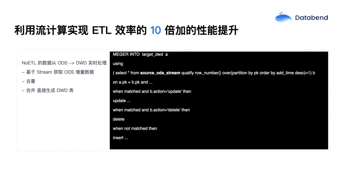首先,数据原封不动地进入 Databend,但是需要进行去重处理。去重之后,根据数据的具体动作类型进行不同的处理逻辑。比如,使用 MERGE INTO 语句,首先根据刚才提到的增量 stream 表,使用 row_number 获取数据并保留最新的一行,创建一个中间表用于后续处理。之后再根据具体的数据动作进行判断:如果动作是 UPDATE,就执行更新操作;如果动作是 DELETE,则执行删除操作,甚至也可以执行假删除。这些动作都可以通过 SQL 语句明确地定义和实现。如果数据没有匹配到已有的数据,可以直接执行 INSERT。