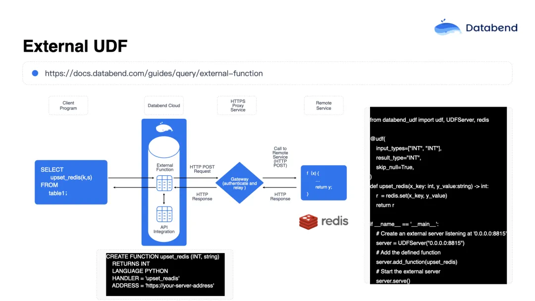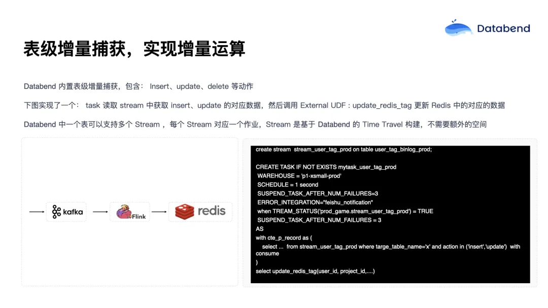 很多海外用户会通过这种方式把数据写入 MySQL 或其他比较大的湖仓产品,或者直接提供外部服务的 Redis 等产品。这种方案基本上可以视为一个标准方案,即逐步使用 Databend 提供的增量捕获能力替代原有的 Kafka 组件,同时通过外部的 UDF 替代原有的 Flink 处理。