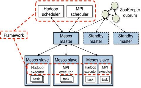 可以从上图看出,Mesos 采用了经典的主-从(master-slave)架构,其中主节点(管理节点)可以使用 zookeeper 来做 HA。Mesosmaster 服务将运行在主节点上,Mesos slave 服务则需要运行在各个计算任务节点上。负责完成具体任务的应用框架们,跟 Mesos master 进行交互,来申请资源。