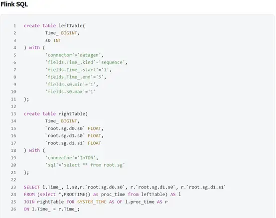 再比如调用 Flink 中的 Lookup Point 操作,将 IoTDB 中的 device 作为维度表进行 Lookup 查询。Flink SQL 如下所示:
