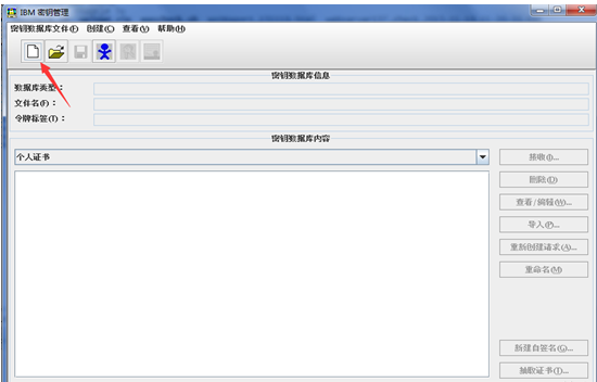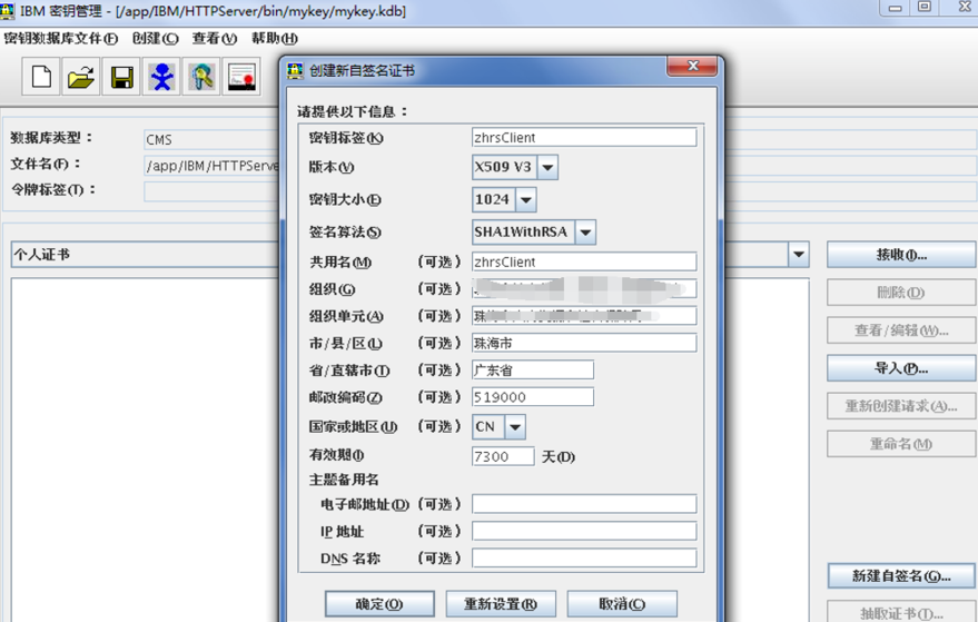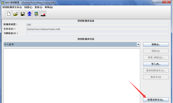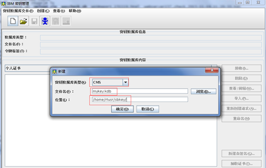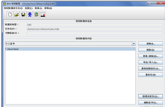 配置https,需要调用图形界面,请登录服务器图形窗口或是使用xmanger软件调出图形窗口来安装,这里就不详细介绍配置方法,直接进入配置主题。 启动his bin目录下的ikeyman(x11, export DISPLAY, export LANG等,LANG是中文启动也会中文)