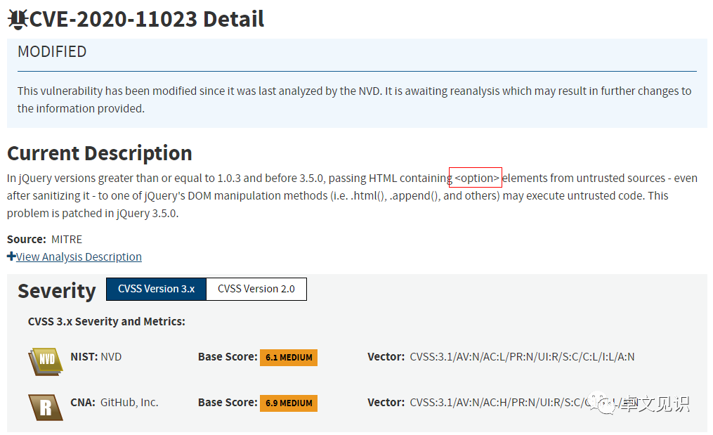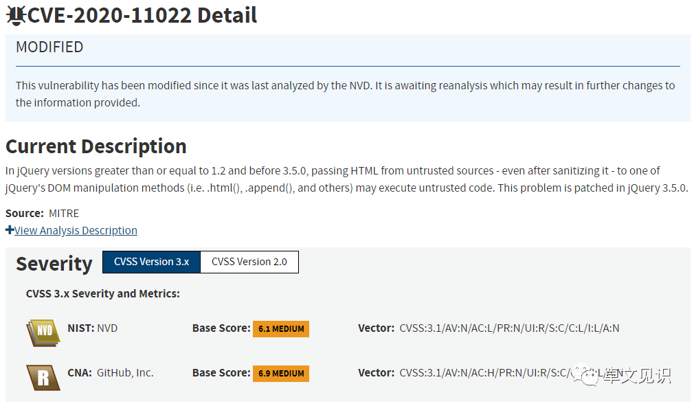据NVD描述:在大于或等于1.2且在3.5.0之前的jQuery版本中,即使执行了消毒(sanitize)处理,也仍会执行将来自不受信任来源的HTML传递给jQuery的DOM操作方法(即html()、.append()等),从而导致xss漏洞。