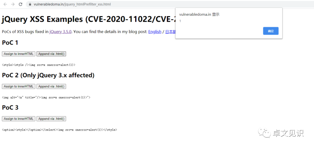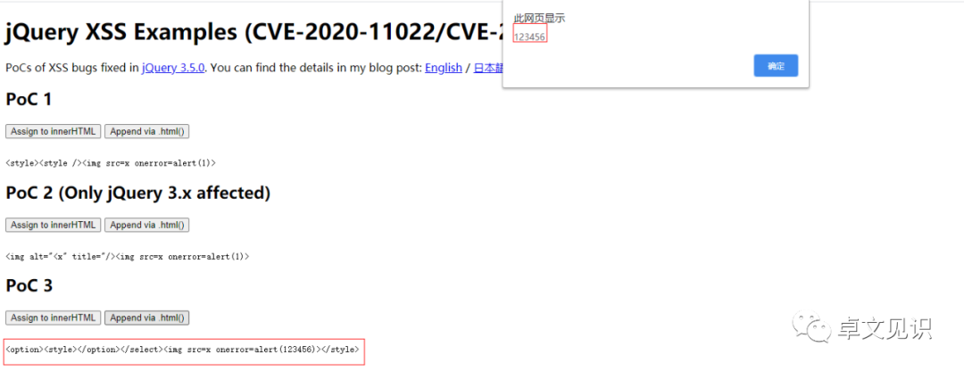 对于此漏洞原作者搭建了在线环境,内置了三个xss poc,点击Append via .html()按钮即可触发xss: