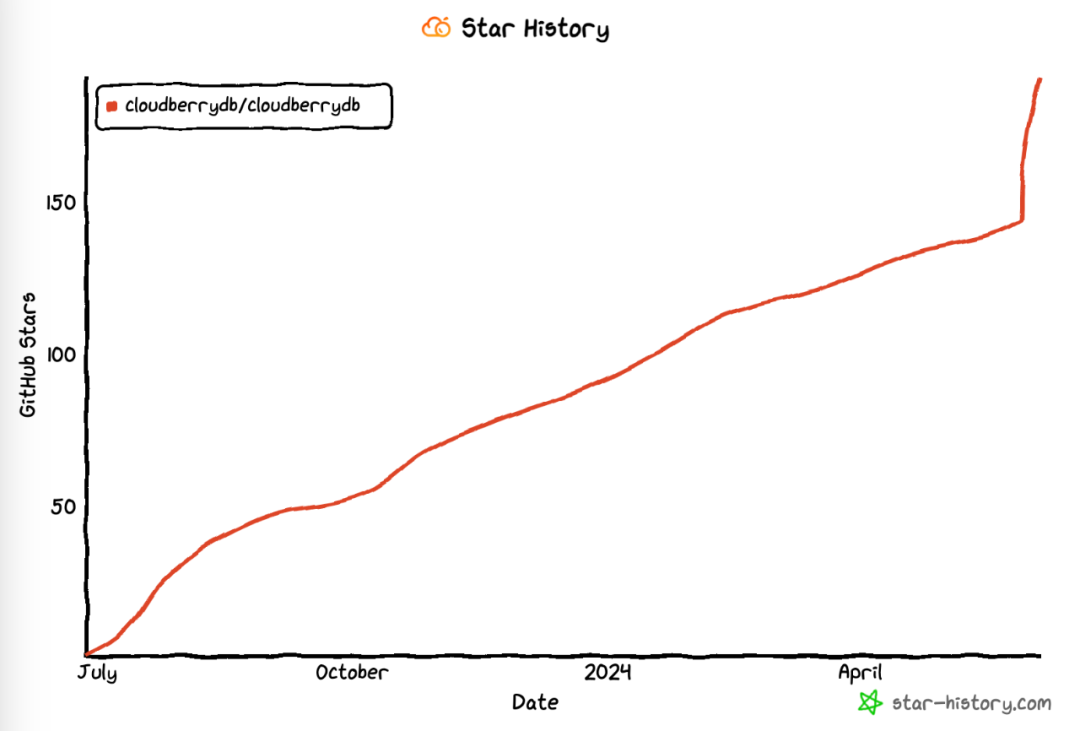 在过去的周末,Cloudberry Database 连续 2 天上榜“GitHub 热门仓库” - C 语言类热门项目。特别感谢大家的支持,Cloudberry Database 关注度近期持续上升: