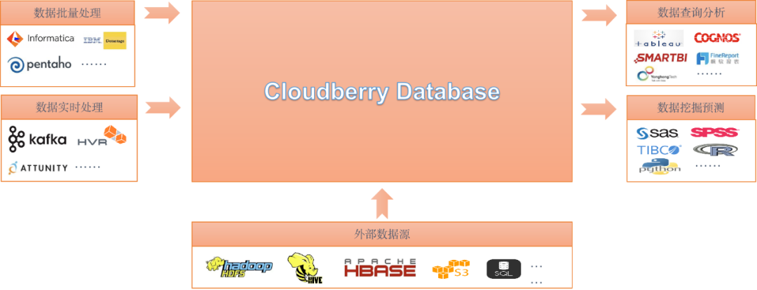 在生态方面,CloudberryDB 完美兼容第三方产品,与主流 BI 工具、挖掘预测工具、ETL 工具、J2EE/.NET 应用程序以及其他数据源/计算引擎均有良好连通。
