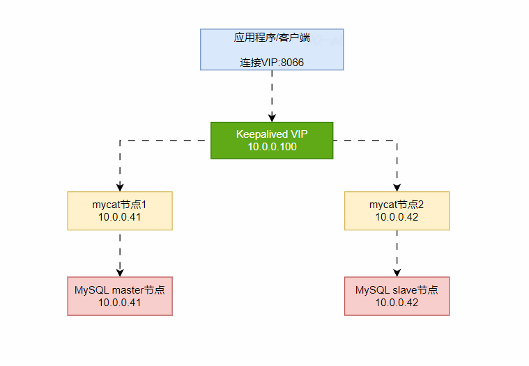 默认情况下,VIP 在主节点上,MyCAT 监听 8066 端口 如果主节点的 MyCAT 异常,VIP 会自动漂移到备节点 客户端通过 VIP 访问,无需关心实际 MyCAT 节点的变化