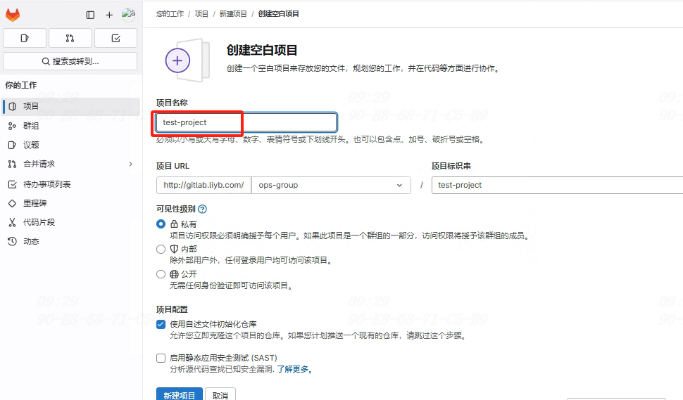 GitLab首页→新建项目/仓库→创建空白项目