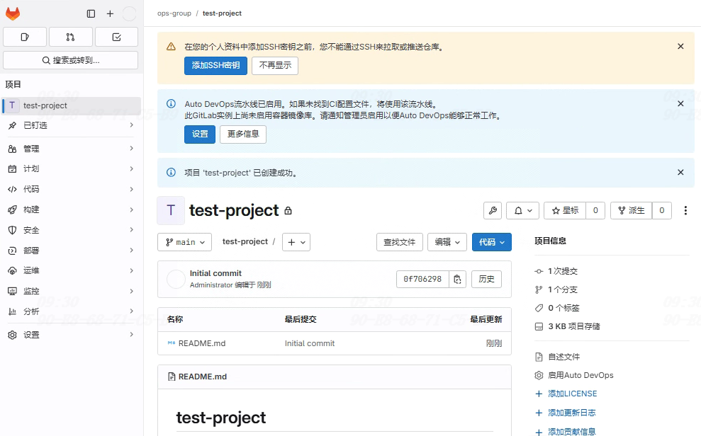 单击“新建项目”按钮,创建空白项目并进入GitLab项目页面
