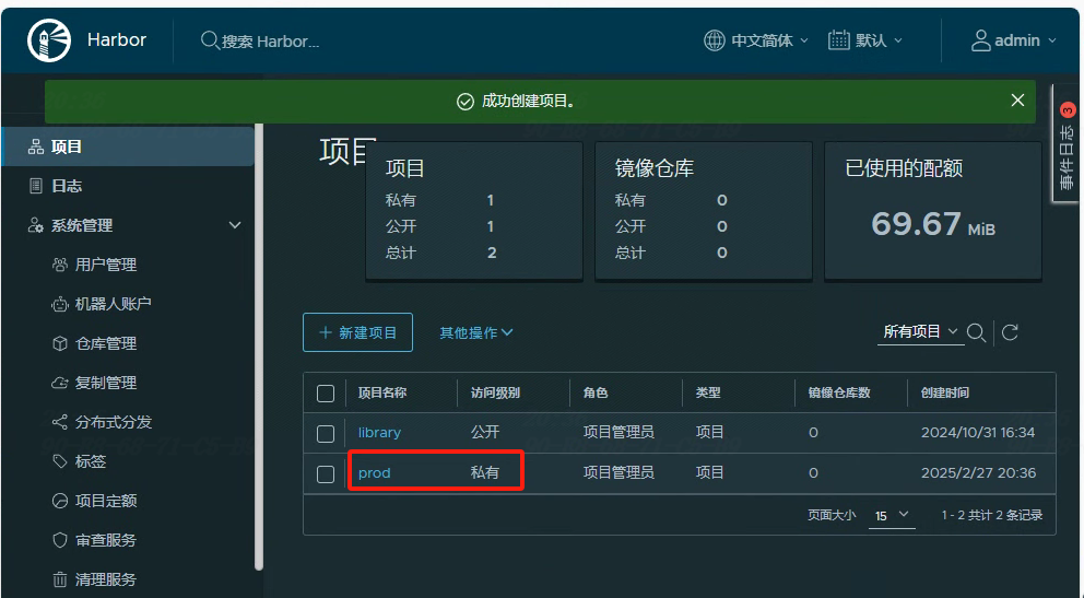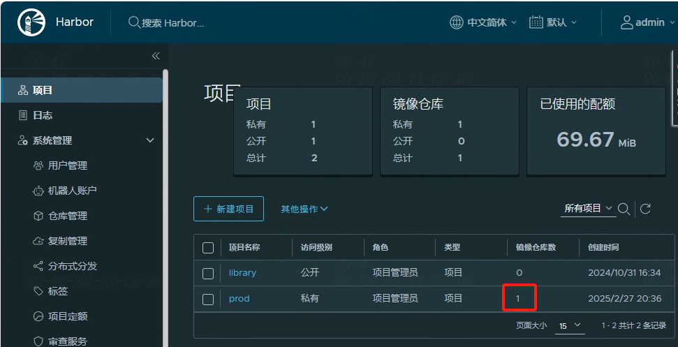 推送成功,在项目prod下面可以看到已经有一个镜像。
