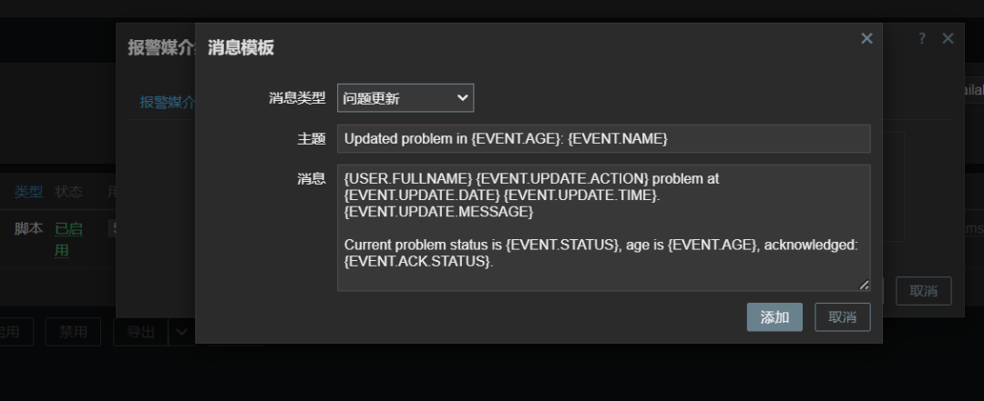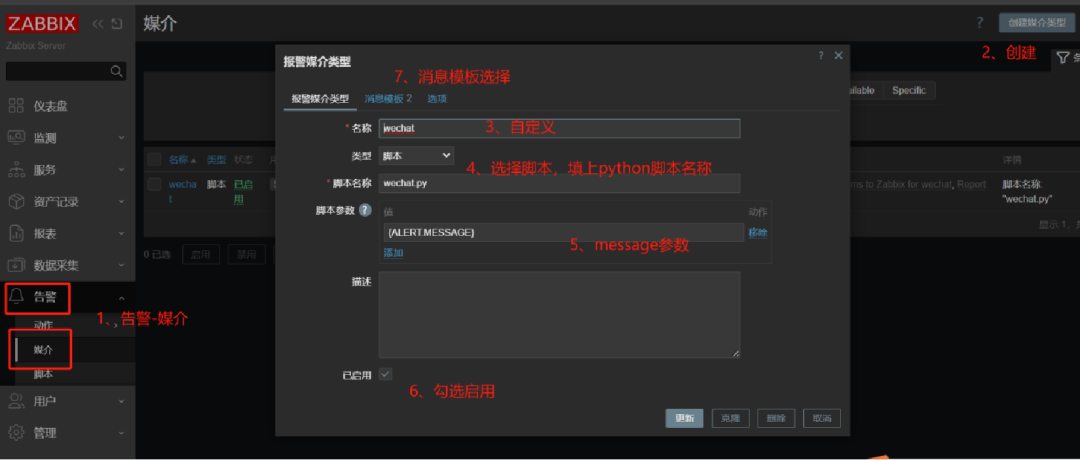 在告警--媒介,我们新建一个,选择媒介类型为脚本,具体如下图: