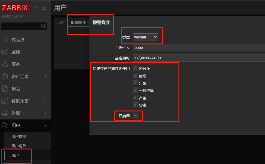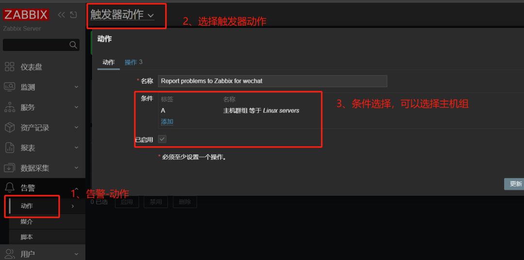 告警--动作,创建一个触发器用来发送告警给对应的组和人员。具体如下图:
