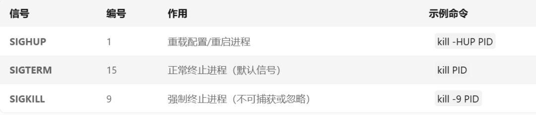 kill -HUP 发送 SIGHUP 信号,属于“友好”操作,进程可选择响应(如重载配置)或忽略。我们可以用在动态更新服务配置(如修改 Nginx 配置后重载);守护进程(daemon)的优雅重启;或者某些程序(如 Tomcat)会通过 HUP 信号触发重启。
