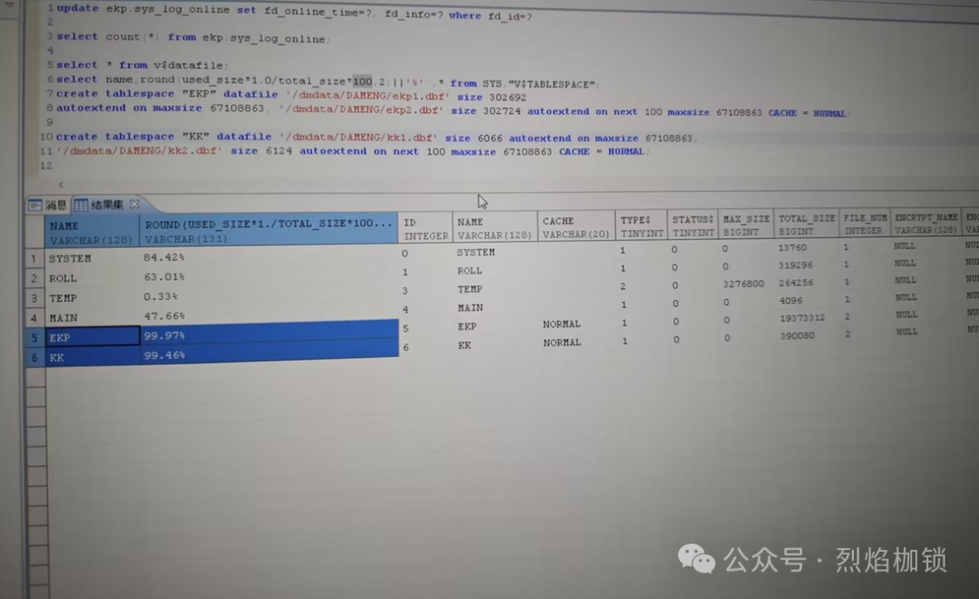 观察表空间使用率,发现其中两个表空间均已达到99%以上。 并且表空间创建语句中,数据文件设置了自动扩展,但缺省值为1MB。