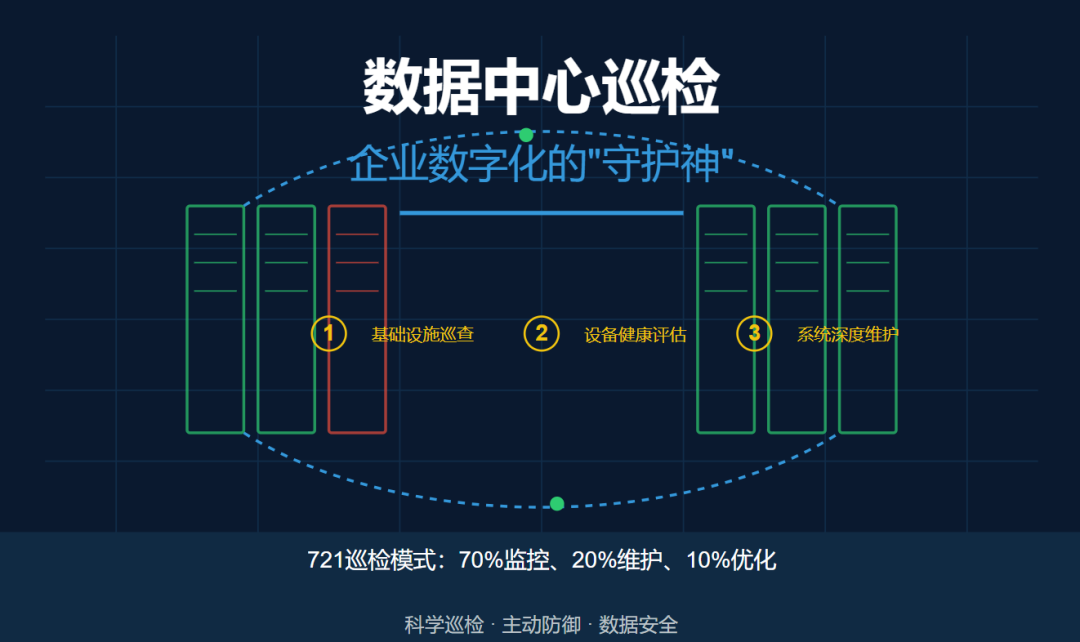 数字化时代的机房巡检需从"被动响应"转向"主动防御"。建议采用"721巡检模式":70%时间用于日常监控,20%时间进行专项维护,10%时间致力于创新优化。这种科学合理的巡检机制将为企业数据中心保驾护航,为数字化业务提供坚实保障。