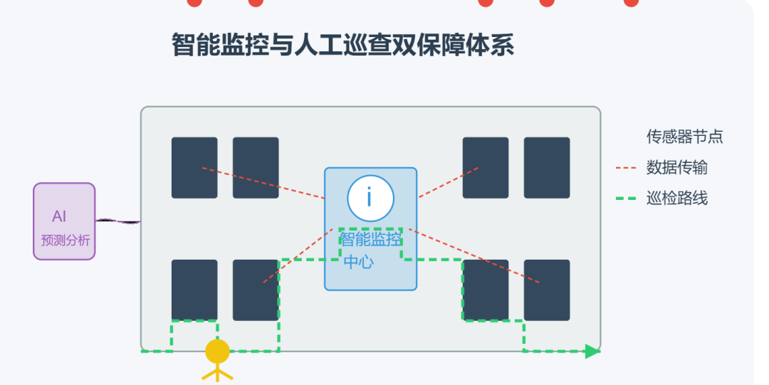 利用物联网传感技术实时监测机房温湿度、烟雾和漏水情况,同时制定科学巡检路线,重点人工检查监控死角,如机柜顶部线缆和消防管道接口等。结合AI算法分析历史数据,预测设备可能出现的故障趋势,提前采取预防措施。