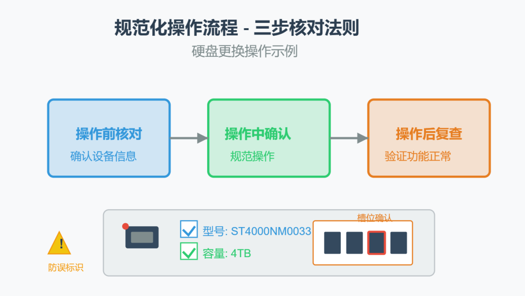 严格执行"操作前核对、操作中确认、操作后复查"的三步核对原则。例如,更换硬盘前必须核对型号、容量及服务器位置信息。同时使用防误操作标识,对重要设备配置进行可视化标记,确保操作精准规范。