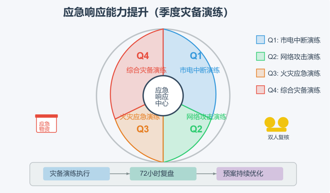 文档更新:及时更新资产台账记录设备变更情况,确保账实相符;根据演练发现的问题和技术发展调整完善应急预案。