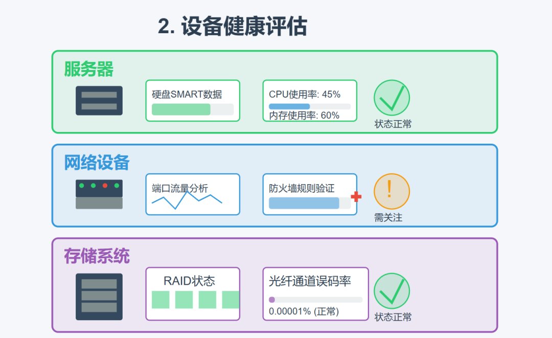 存储系统:检查RAID状态确保数据冗余和安全,监测光纤通道误码率保证数据传输稳定。